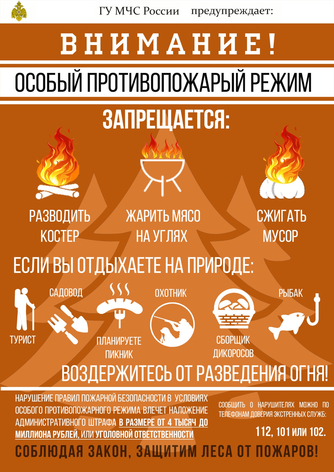 В период действия особого противопожарного режима запрещается в лесах разводить костры, разжигать мангалы, сжигать бытовые и промышленные отходы, выжигать траву на земельных участках, примыкающих к лесам, хозяйственным постройкам и зданиям.